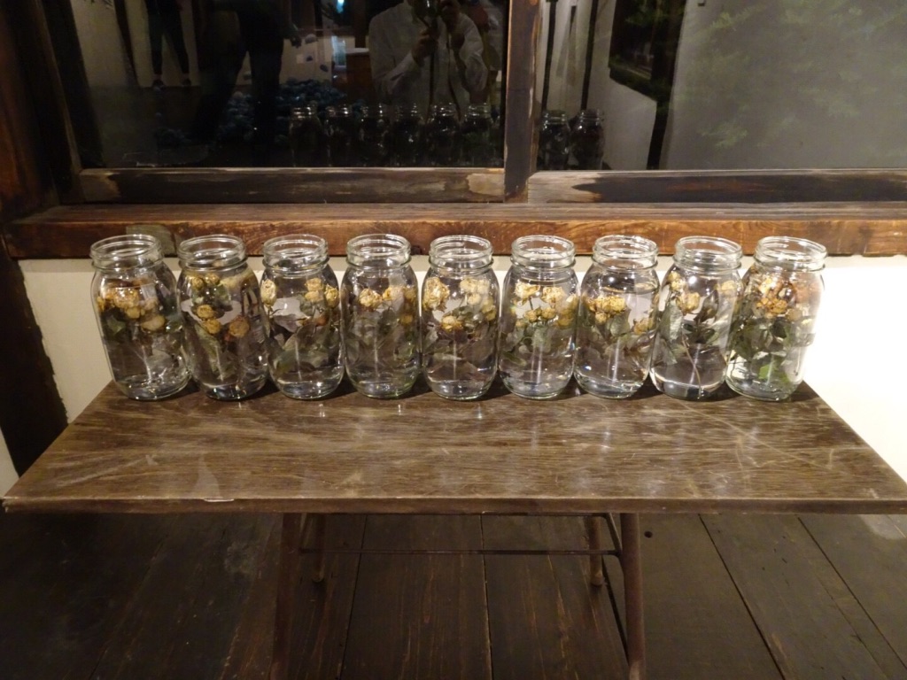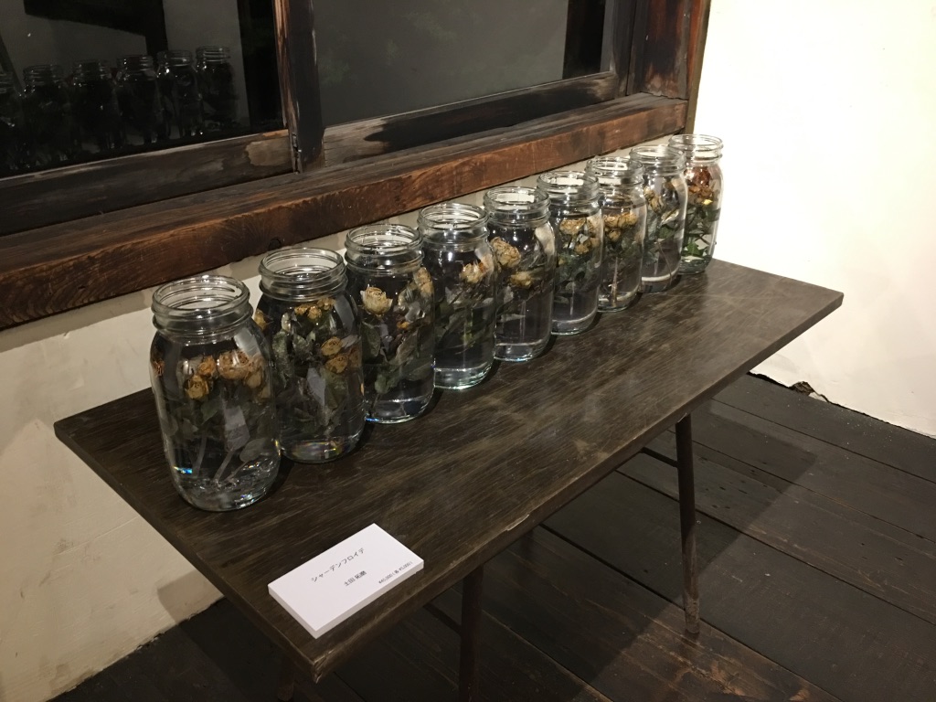 メディア:ガラス、乾燥した黄色いバラ、樹脂